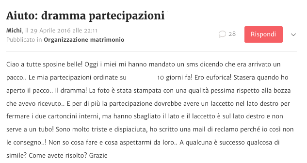 Il problema però, in questo caso, è un altro: la sposa era convinta che avrebbe ricevuto una partecipazione di un certo livello, e invece si è ritrovata con un prodotto moooolto al di sotto delle sue aspettative. Perchè? Perchè le ha ordinate a distanza, senza vedere MAI un campione cartaceo della partecipazione che andava ad ordinare.