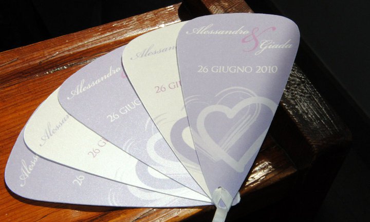 Sì, avete capito bene: un’idea decisamente originale, se vi sposate in estate e temete che i vostri invitati possano soffrire troppo il caldo, è far trovare sui banchi della chiesa, vicino o sopra il libretto messa, un bel ventaglio pronto per essere sventolato. In questo modo eviterete di accompagnare la cerimonia con il fastidioso rumore delle pagine del libretto messa che scricchiolano mentre gli invitati le usano per farsi aria (mandando così a farsi benedire anche la funzione principale del libretto e tutta la cura che avete messo, dopo aver letto gli articoli precedenti, nel confezionarlo).