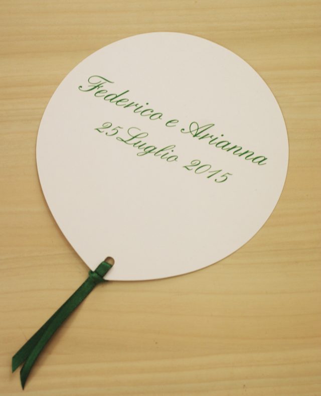 Il ventaglio può essere realizzato in cartoncino, magari perlato o nello stesso utilizzato nelle partecipazioni e in tutti gli altri stampati del matrimonio, e strutturato a petali (con stampati sopra i nomi degli sposi e la data del matrimonio e, se presente, il simbolo grafico), tenuti insieme da un nastro di raso o organza del colore dominante. Si può anche prevedere un “unico petalo”, più grande, con un buchino e un nastrino sotto, oppure il cosiddetto “ventaglio a paletta”, con sotto un bastoncino largo di sostegno (si possono utilizzare gli abbassalingua di legno dei dentisti, facilmente reperibili anche online).