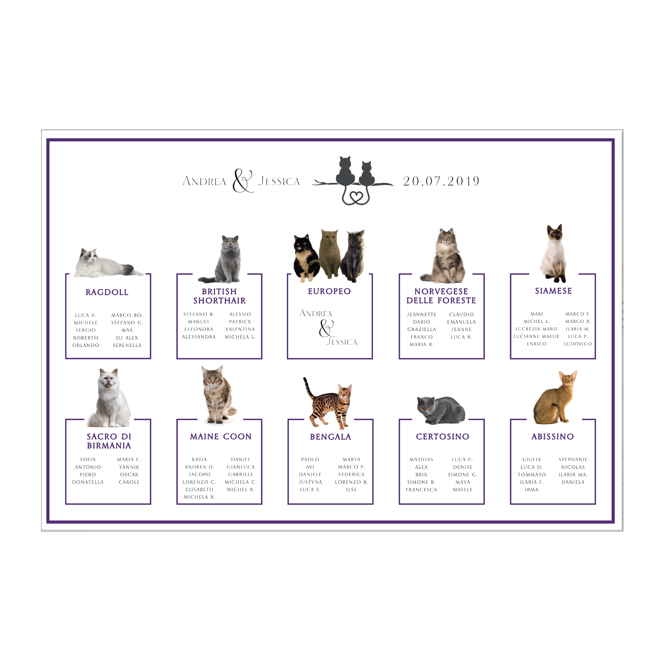 Tableau tema gatti, pannello rigido in forex (materiale plastico) dimensioni 50x70cm o 70x100cm, nomi dei tavoli e colore a scelta. Il tableau è adatto per matrimoni con massimo 12 tavoli (per un numero maggiore di tavoli, contattaci via mail a info@fragolalilla.it prima di effettuare l’ordine). Dopo aver effettuato l’ordine, scrivici a info@fragolalilla.it per procedere con la grafica personalizzata (puoi ordinare il tableau anche molti mesi prima rispetto alla data del matrimonio, l’importante è che tu abbia una lista – ovviamente provvisoria – degli invitati suddivisi nei diversi tavoli, in modo da poter procedere alla realizzazione della prima bozza personalizzata). La stampa della versione definitiva avverrà una settimana prima del matrimonio, quando avrai le conferme definitive e potrai darci l’elenco dei tavoli (non preoccuparti, siamo perfettamente attrezzati per stampare e spedire in 2 giorni, riceverai il tuo tableau in tempo per il matrimonio!). Se hai comunque esigenza di ricevere il tableau in anticipo rispetto ai tempi standard, non preoccuparti, comunicacelo al momento dell’ordine e seguiremo le tue indicazioni!