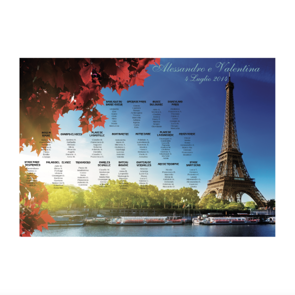 Tableau tema Parigi, pannello rigido in forex (materiale plastico) dimensioni 50x70cm o 70x100cm, nomi dei tavoli e colore a scelta. Il tableau è adatto per matrimoni con massimo 12 tavoli (per un numero maggiore di tavoli, contattaci via mail a info@fragolalilla.it prima di effettuare l’ordine). Dopo aver effettuato l’ordine, scrivici a info@fragolalilla.it per procedere con la grafica personalizzata (puoi ordinare il tableau anche molti mesi prima rispetto alla data del matrimonio, l’importante è che tu abbia una lista – ovviamente provvisoria – degli invitati suddivisi nei diversi tavoli, in modo da poter procedere alla realizzazione della prima bozza personalizzata). La stampa della versione definitiva avverrà una settimana prima del matrimonio, quando avrai le conferme definitive e potrai darci l’elenco dei tavoli (non preoccuparti, siamo perfettamente attrezzati per stampare e spedire in 2 giorni, riceverai il tuo tableau in tempo per il matrimonio!). Se hai comunque esigenza di ricevere il tableau in anticipo rispetto ai tempi standard, non preoccuparti, comunicacelo al momento dell’ordine e seguiremo le tue indicazioni!