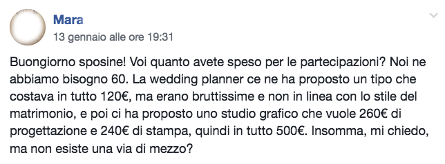 Sono seguiti decine di commenti tra cui spiccavano “è una rapina”, “fattele da sola” e l’onnipresente “le partecipazioni sono carta straccia che tutti buttano”. Sorvolando sui falsi miti sulle partecipazioni che anche questa volta sono usciti in maniera evidente (se vuoi fare un ripasso, ne abbiamo parlato qui) e sul fatto che farsele da soli equivale sempre ad ottenere giocoforza un risultato che non è e non sarà mai quello desiderato e previsto (io non sono una pasticciera, perciò so che se decido di cucinarmi una torta da sola e decorarmela in pasta di zucchero, non avendo le competenze necessarie e non essendo specializzata in questo, ne uscirà al 100% una schifezza disumana ben lontana dalle mie aspettative), il punto centrale è un altro: qual è – e quale viene percepito come – il prezzo giusto per delle partecipazioni di nozze?