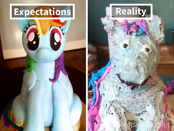 La torta a sinistra è realizzata da un pasticciere specializzato in decorazioni in pasta di zucchero, la torta a destra da un festeggiato che ha pensato “che ci vuole, così risparmio soldi”.