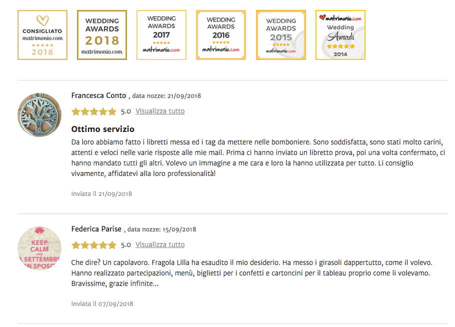 Le recensioni delle spose sono per noi estremamente importanti per noi soprattutto per una ragione: ci permettono di capire se stiamo andando nella direzione giusta e se stiamo facendo il massimo per dare loro quello che promettiamo, ossia una wedding stationery completamente personalizzata su di loro, sul loro matrimonio, sui loro gusti, sulle loro esigenze.
